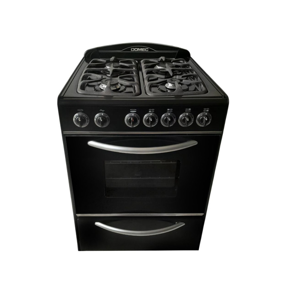 Cocina Multigas, 4 hornallas, puerta horno visor , parrilla, rejillas simil fundición, válvula de seguridad en horno y hornallas, Negra.-