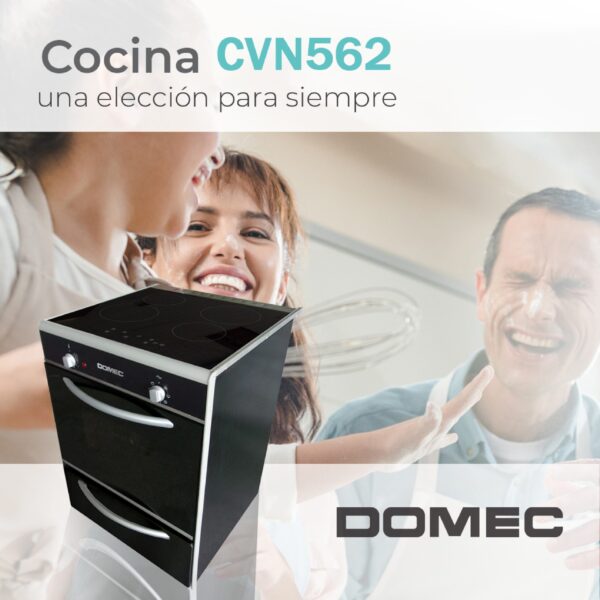 Cocina eléctrica con plancha vitrocerámica, 4 zonas de calor, luz, termostato, bloqueo para niños, timer, indicador de calor residual, grill en horno, puerta doble vidrio, parrilla, negra ancho 56 cms.Tipo Gastronomico para el hogar