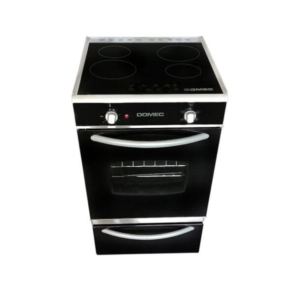 Cocina eléctrica con plancha vitrocerámica, 4 zonas de calor, luz, termostato, timer, grill en horno, puerta doble vidrio, parrilla, negra ancho 50 cms.Tipo Gastronomico para el hogar